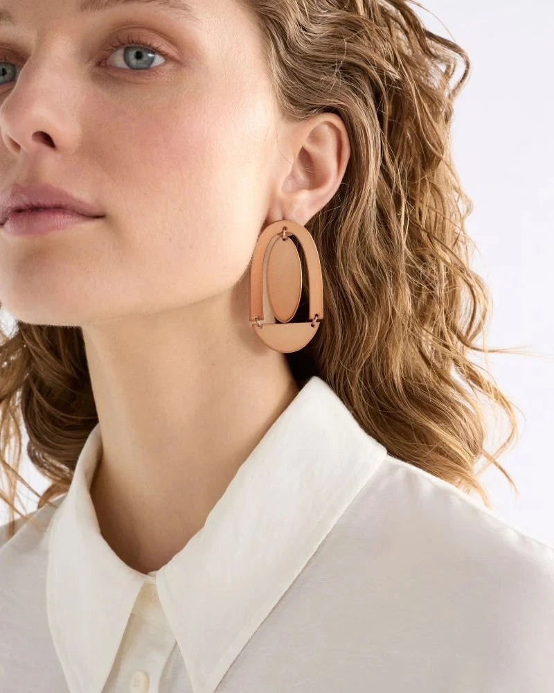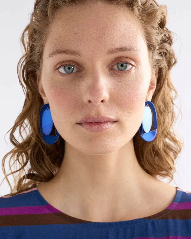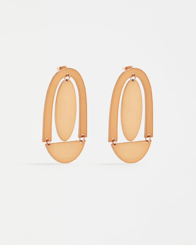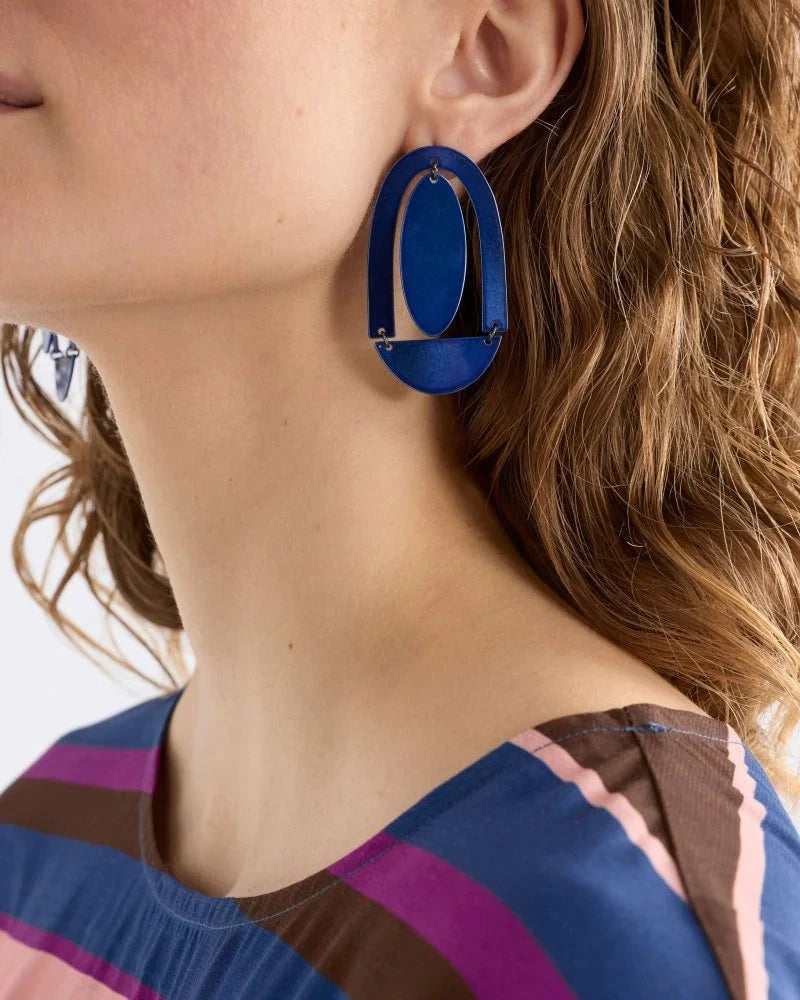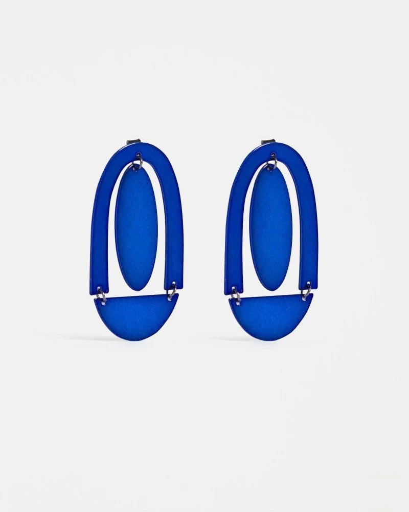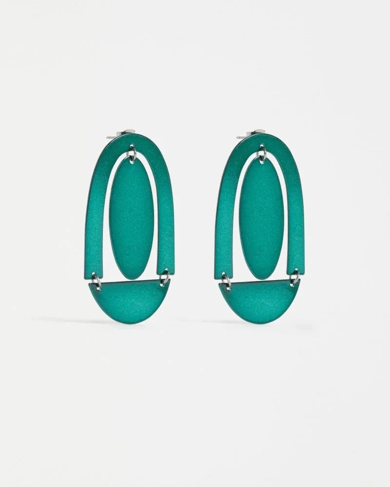 Add a unique pop of colour and shine with Dadem Drop Earrings. These long drop earrings showcase an artful, combination of geometric shapes joined together by jump rings creating playful movement when worn. Coated with an anodised coloured metallic finish, these earrings will take your evening outfits to new heights as they move and catch the light.