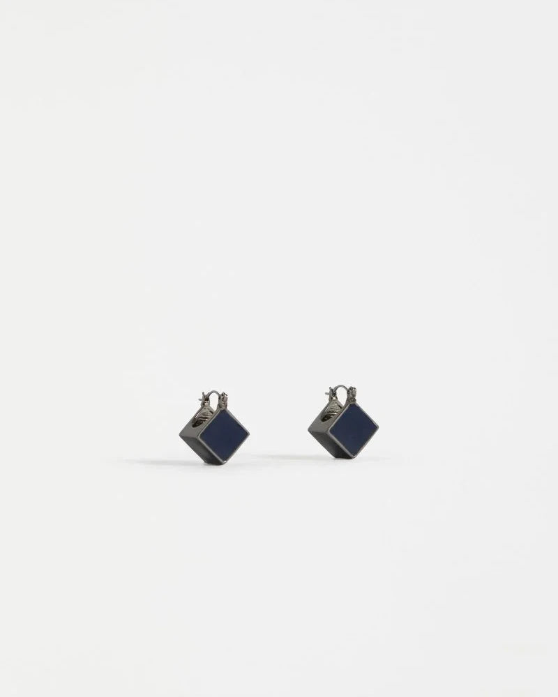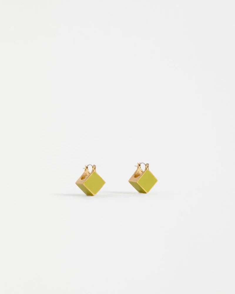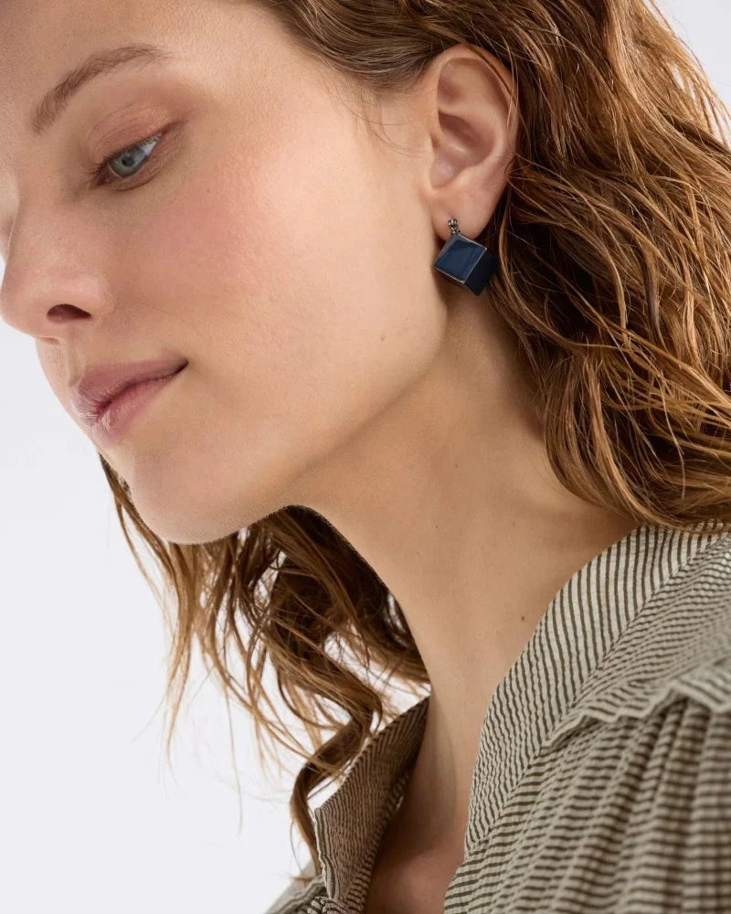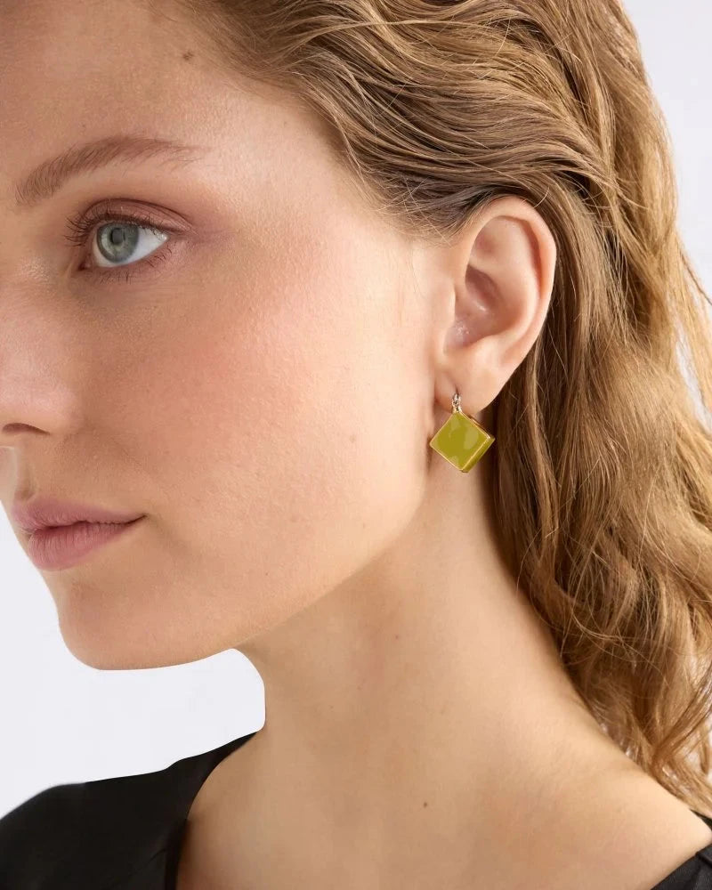 The Elta Mini Hoop Earring is a small lightweight hoop design comprised of simple cubic shape with a closed hinged backing. Finished with a coloured enamel coating and brushed metal base, this lightweight and minimalist style will give a subtle touch of colour and character to your everyday outfits.