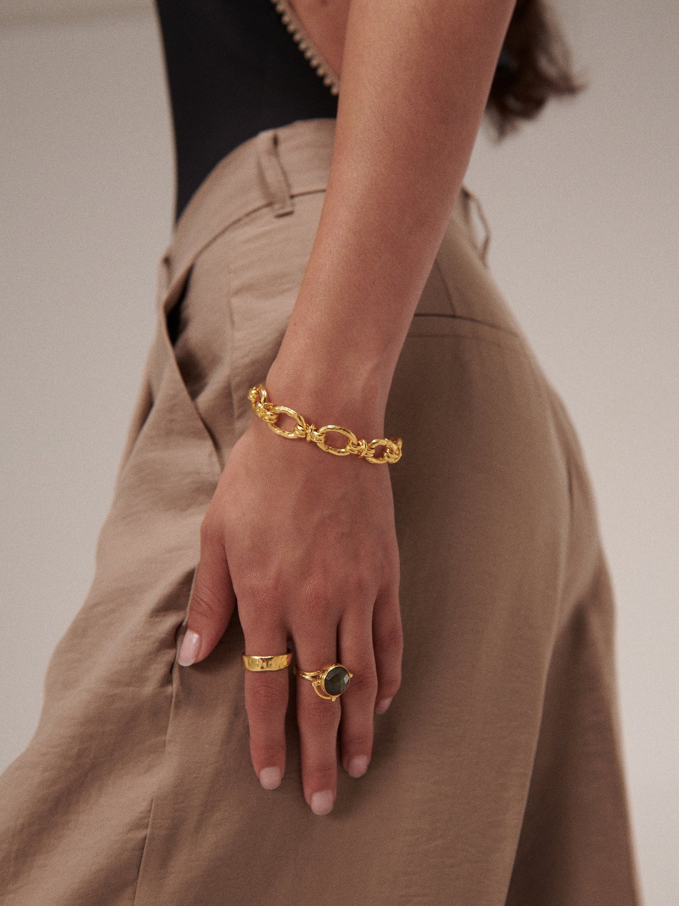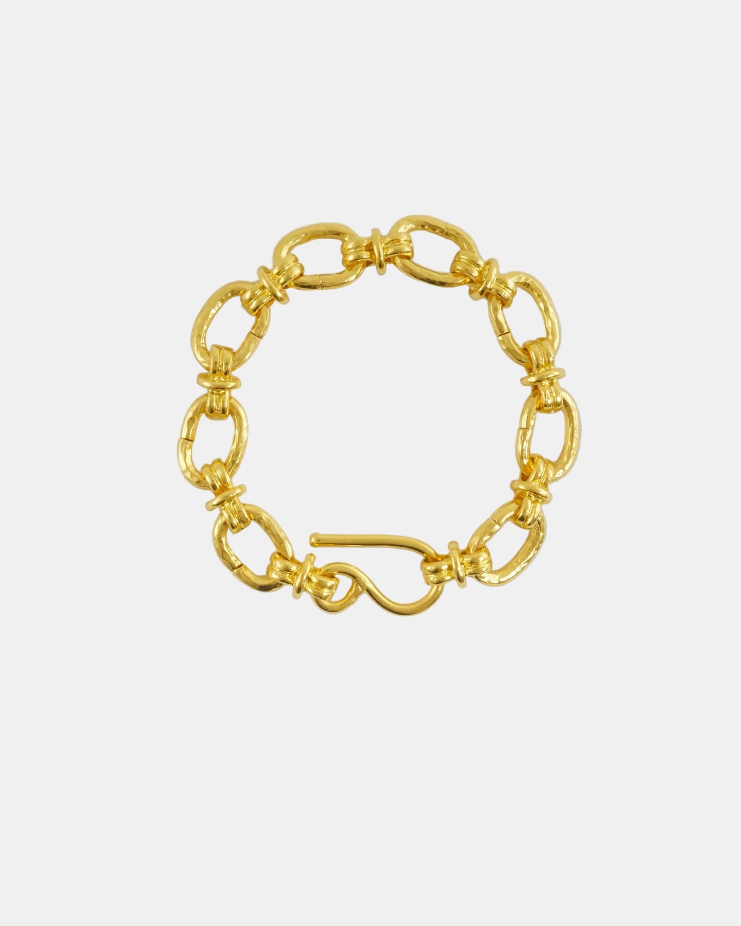 Inspired by timeless antique designs that have never go out of fashion, the Zehra Chain Bracelet features bold gold links and finished with a hammered texture and can be adjusted to fit you best. Our Zehra bracelet is handcrafted sustainably at our Istanbul workshop from 21ct gold-plated recycled brass.