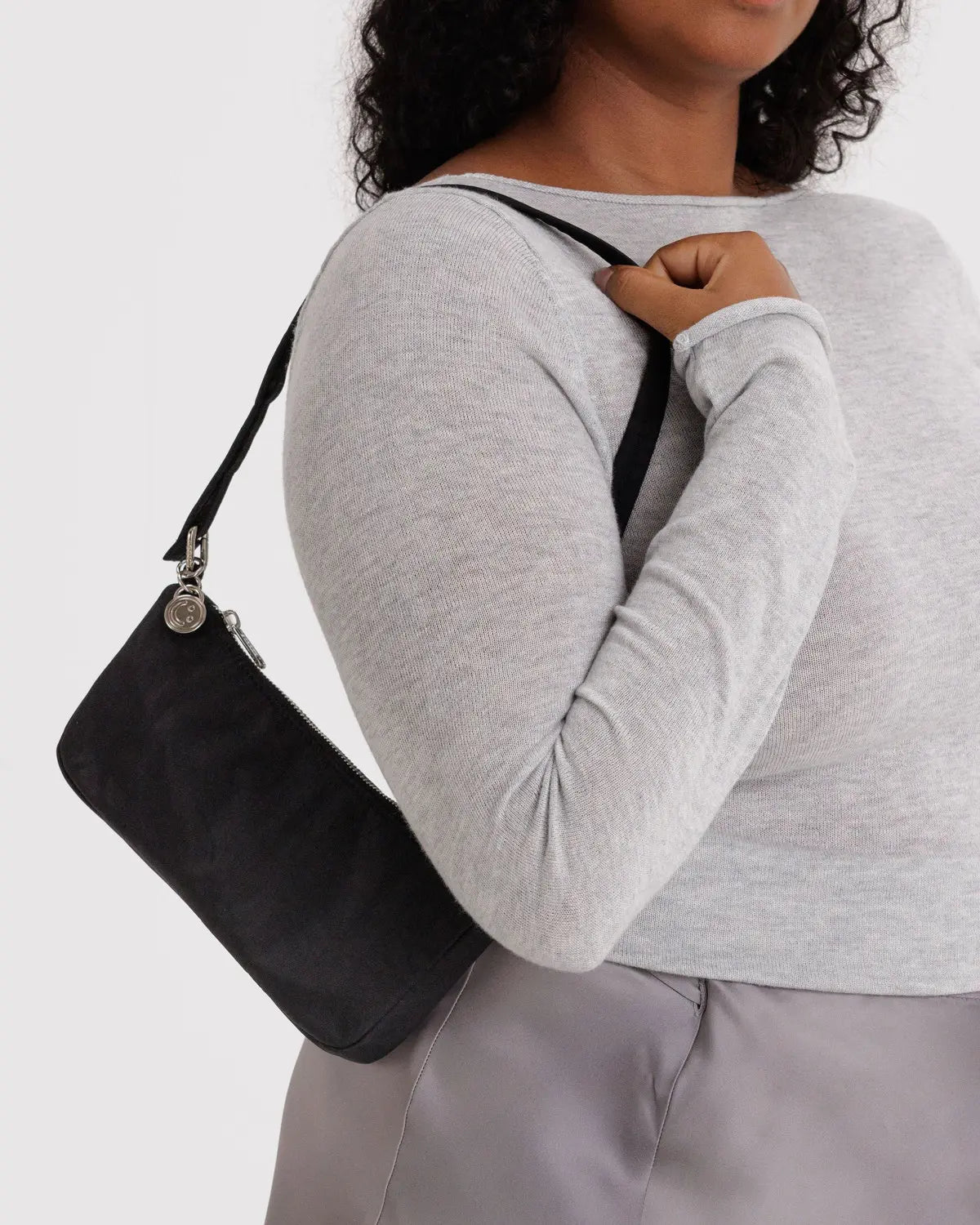A sleek, compact bag featuring built-in card slots for organization, metal charm, and adjustable strap.