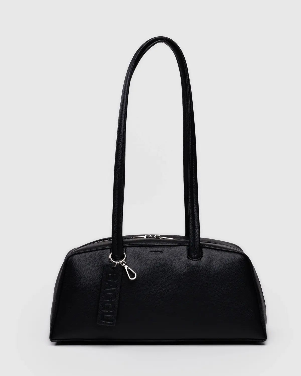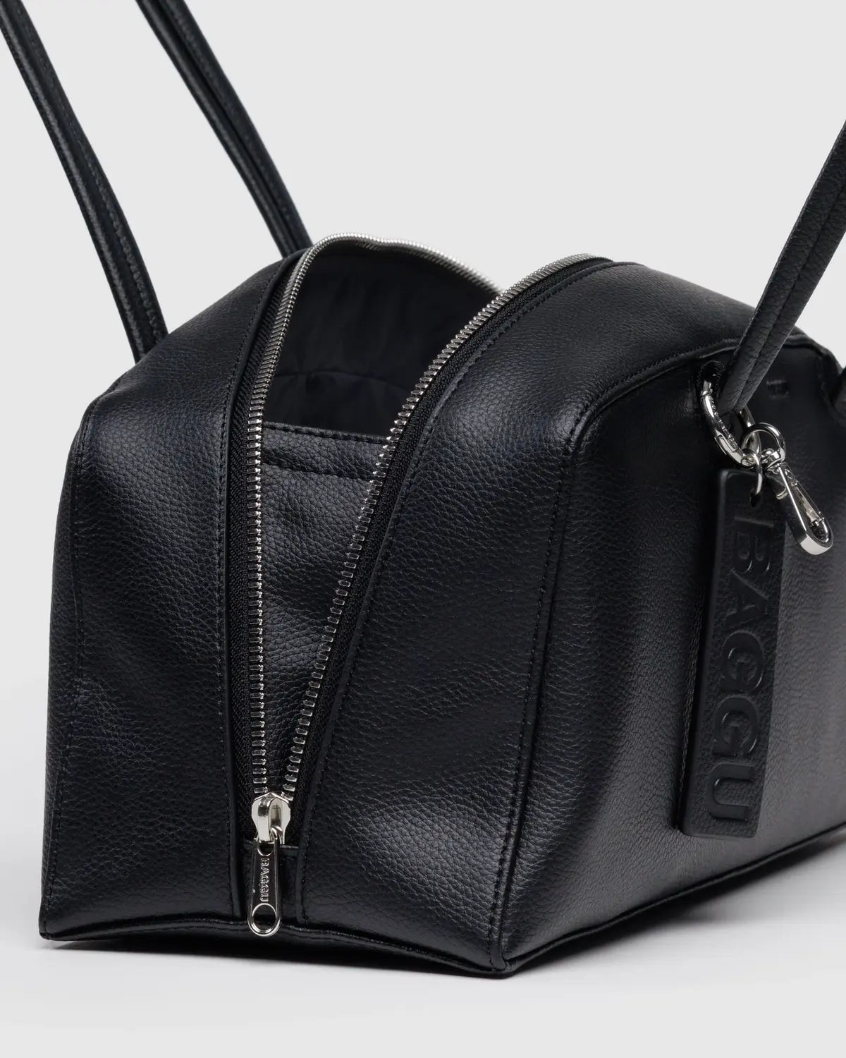 A recycled leather bowler bag designed to be accessorized, with four charm loops and a clip ring. An interior zip pocket keeps things secure and in reach. Extra room fits your book, phone, wallet, keys, and more.
