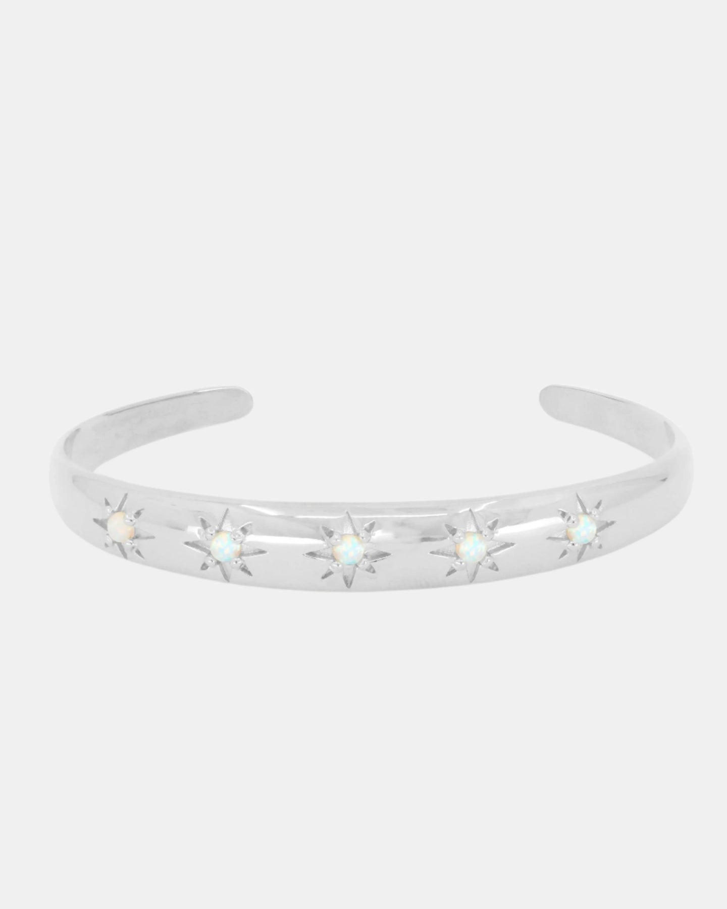The Tonimay Alina Opal Cuff is delicately domed cuff, set with 5 luminous opals. The stunning opals are set in a starburst setting that is the feature of our Alina Capsule collection. The cuff is 9mm at it's thickest, tapering to 5mm at the ends of the cuff.