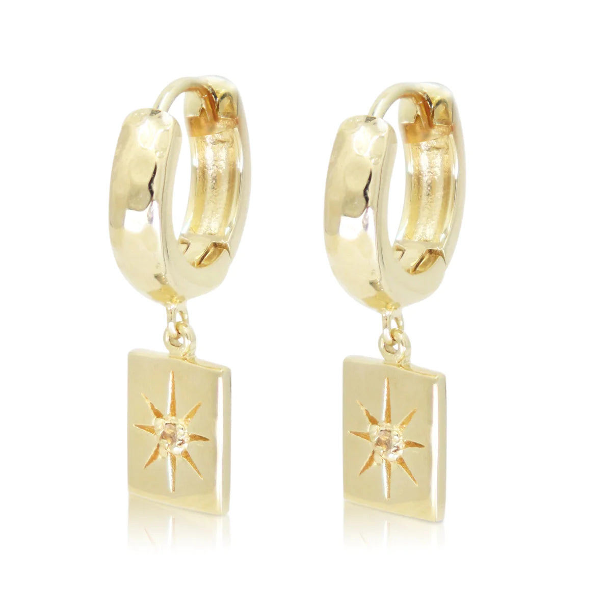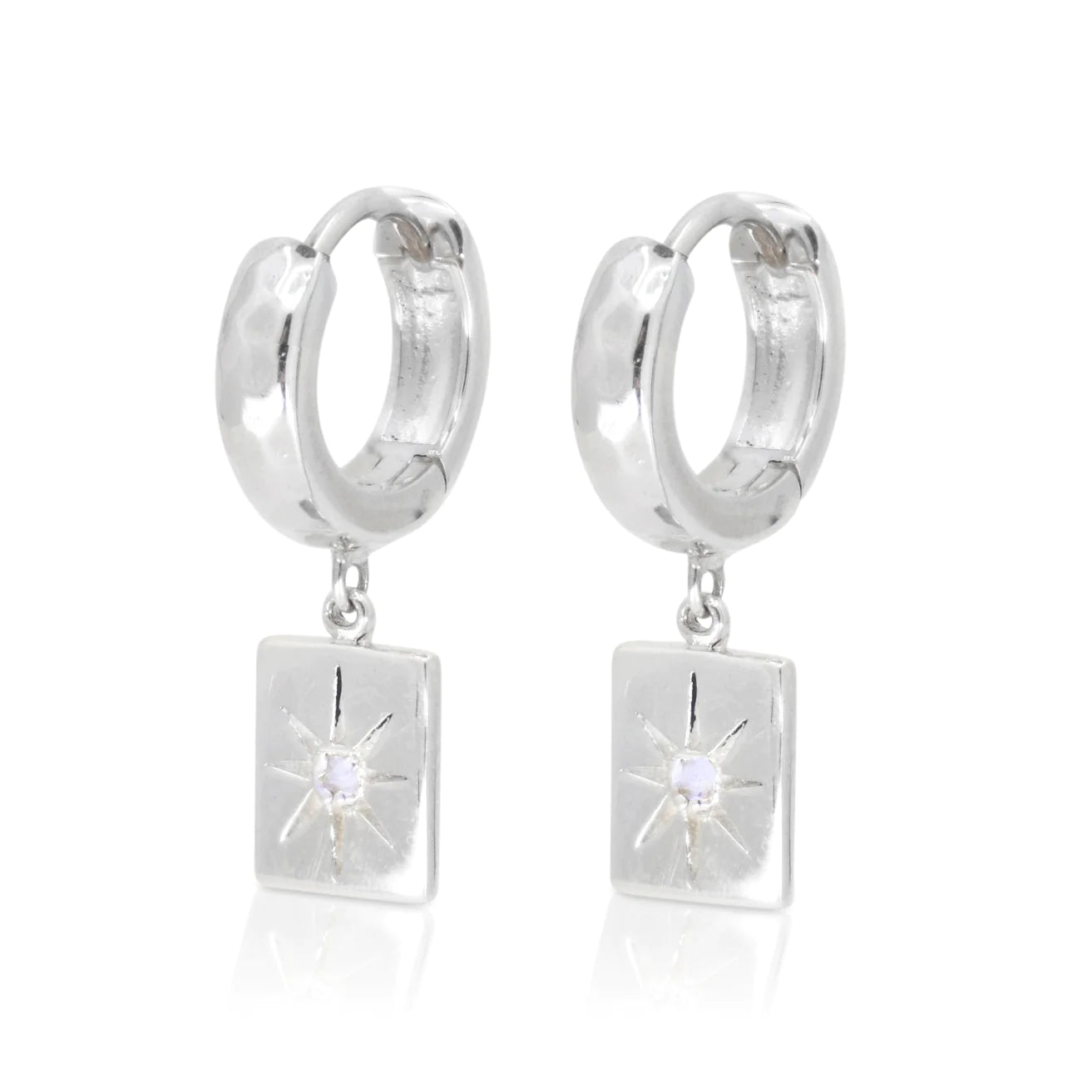 The Starry Night Huggies feature a hand cut moonstone which is claw set into delicate a starburst setting on charm of the earring.