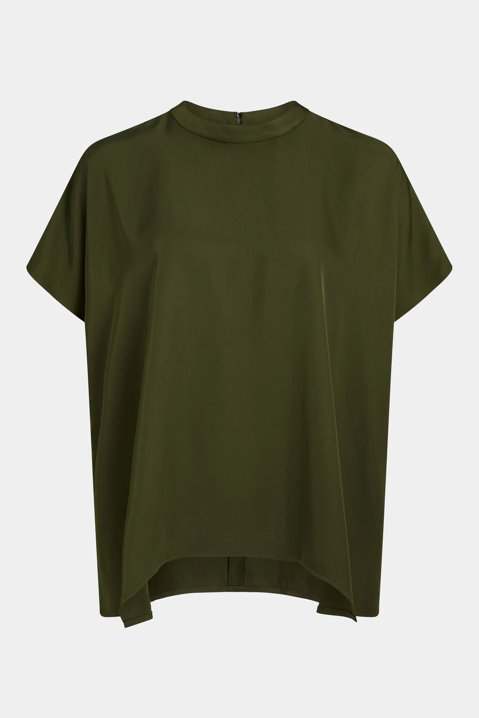 The Hullu Top encapsules relaxed sophistication with its easy, loose silhouette combined with its high, round neckline and contrast topstitch detailing that adds structure and definition to this modern shape. Crafted from a luxuriously, fluid NAIA™ acetate that offers a cool, structured, silk-like softness, subtle sheen and excellent drape and breathability. Featuring a subtle high-low, handkerchief hemline and short batwing sleeves.