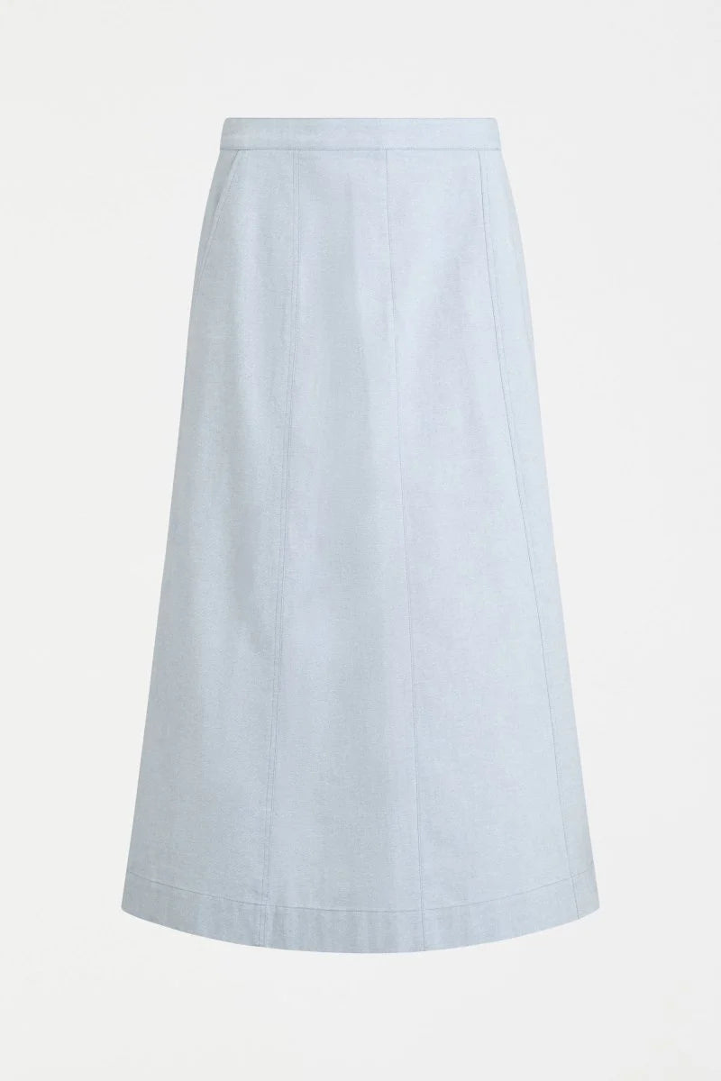 The Hanning Skirt is a midi-length A-line style crafted from a lightweight woven, organic cotton, with a light chambray twill appearance. This regular fit skirt features a panelled design, with elasticated back waist for comfort, angled side-seam pockets, and an invisible side-seam zip. The softly structured A-line design with clean lines creates a relaxed yet refined look.