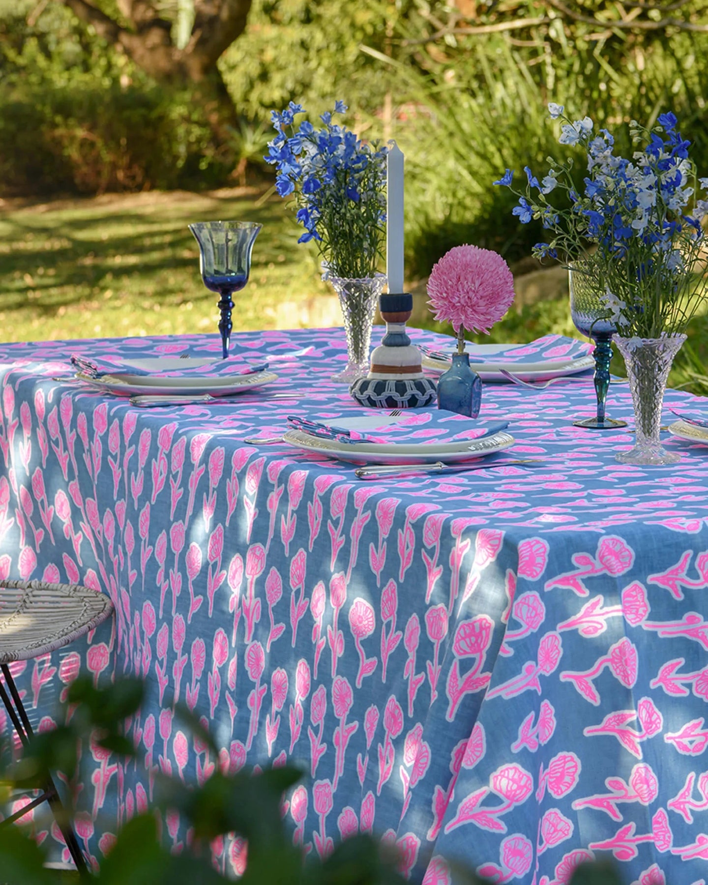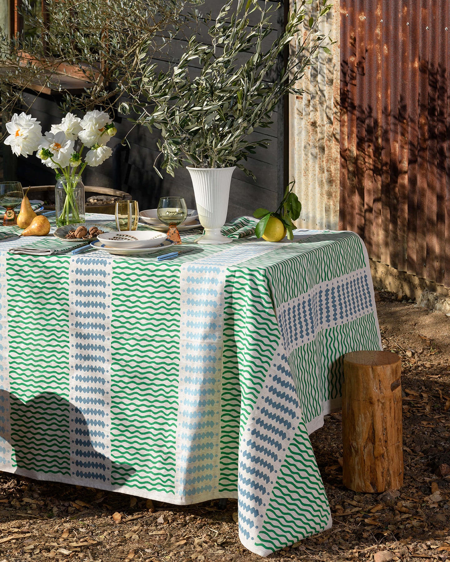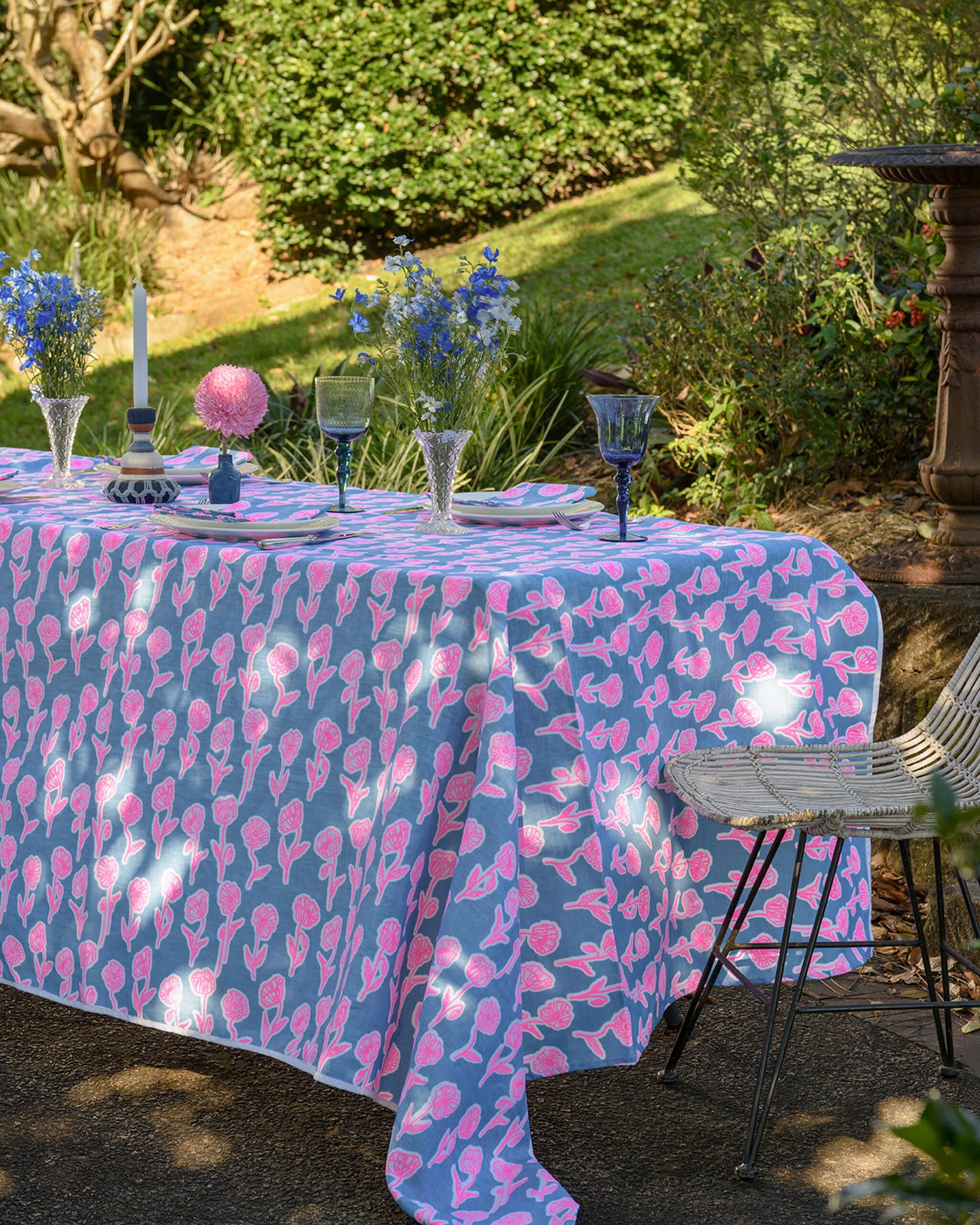 Aqua door Designs drawings are printed on linen. Complete the look with matching napkins. A wonderful statement tablecloth ideal for milestone birthdays and beach settings.