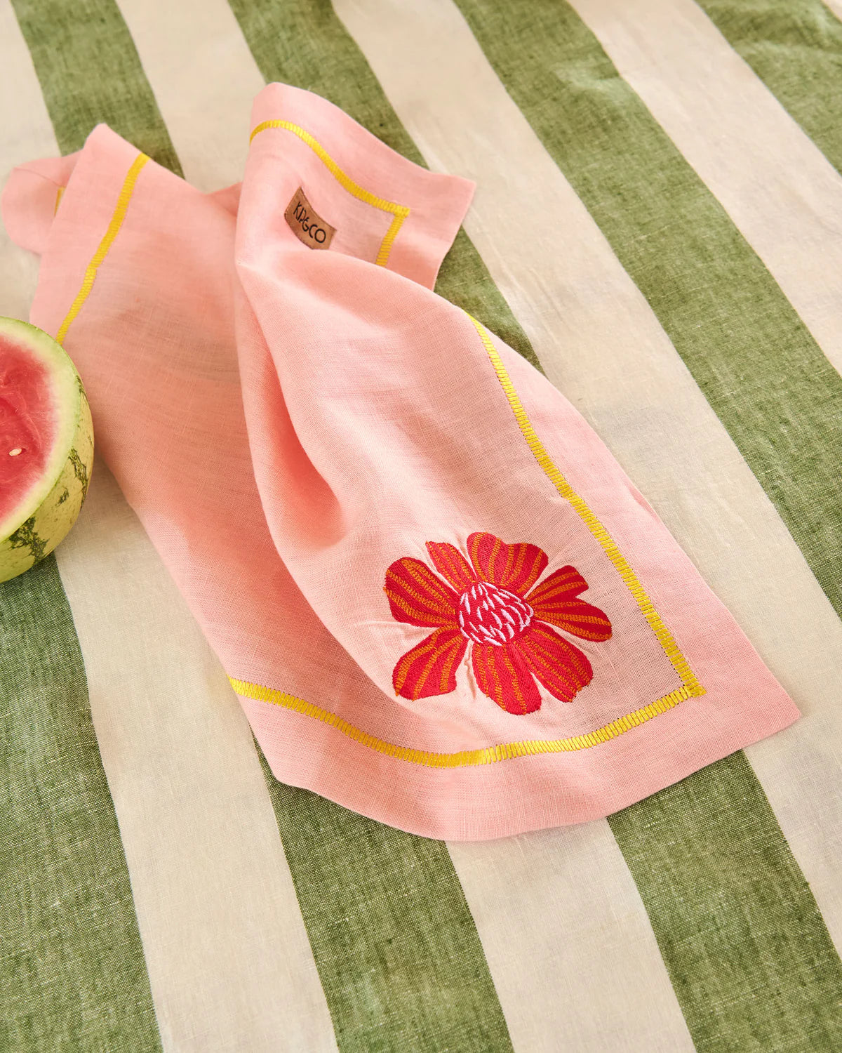 Make a statement with your table décor. The Kip & Co linen napkins aren't just for tidying up; they're playful accents that spark conversations and set the mood for delightful dining moments. Made from 100% French flax linen the Embroidered Linen 4P Napkin Set is simple and sweet.